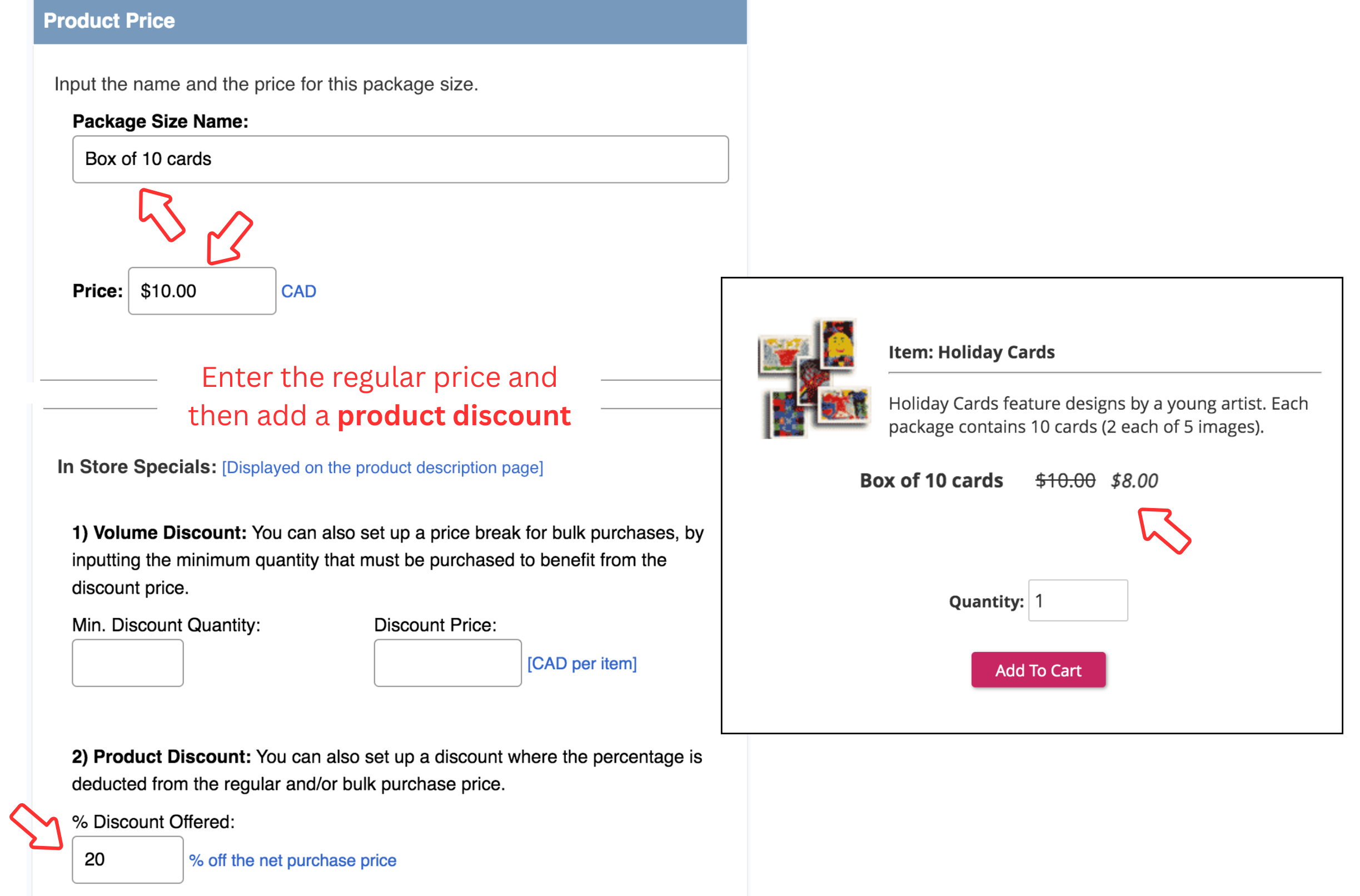 Now you can also prominently display product discounts to all customers shopping online. Permanently display your in-store specials or make them available for a time-limited period only. See example.