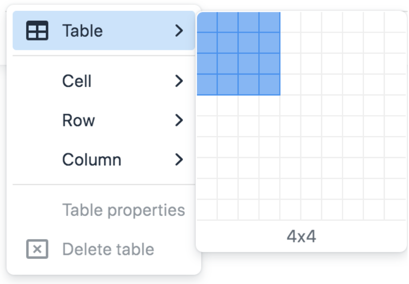 - Hover over the Insert table link to expand the